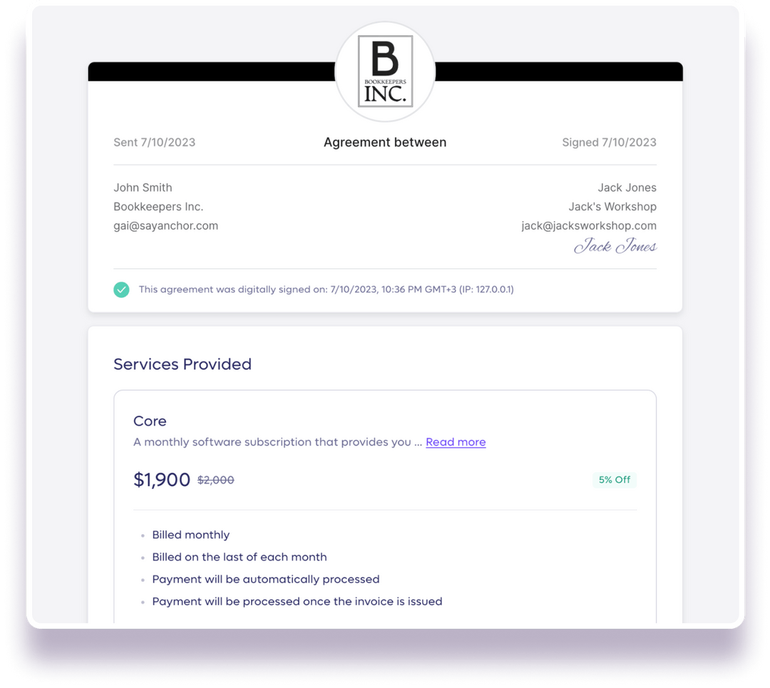 Streamline your billing with smart agreements that hold all information you need for efficient billing, including payment details, payment terms and billing permissions from your client.