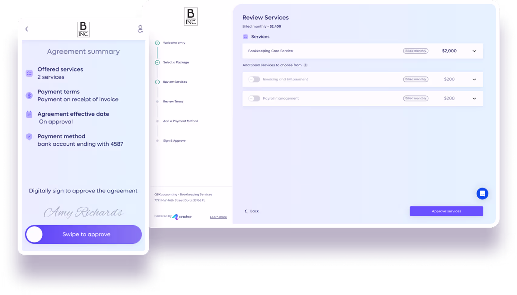 Easily create and send proposals that can be reviewed and signed from any device. Just choose a service from your service library, outline your terms, and send it to your client to sign digitally.