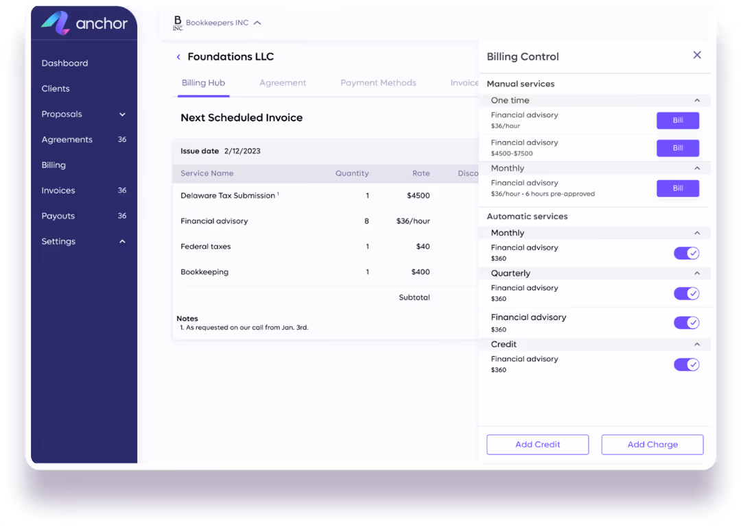 Anchor automates the entire process of getting paid by clients, end-to-end. Send your Anchor proposals, and the platform will auto-invoice, auto-charge, and auto-sync them all with your accounting software.