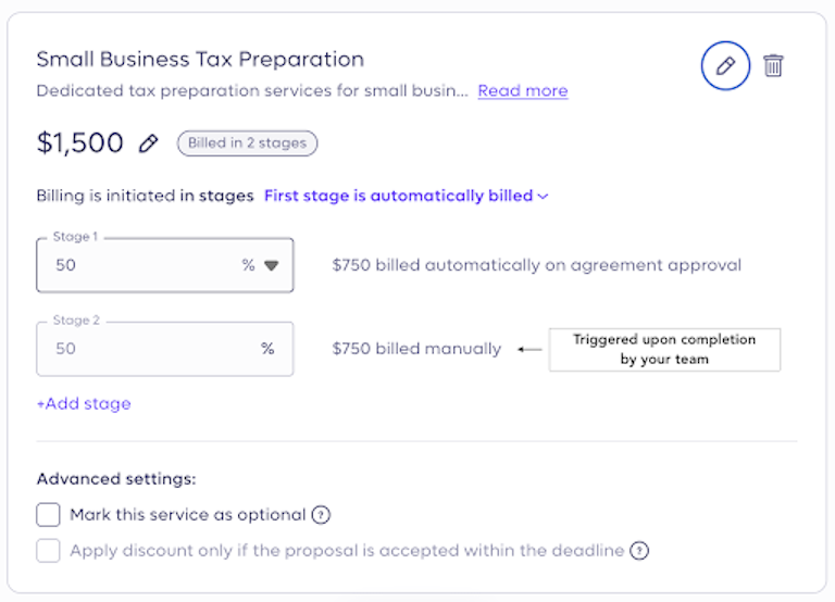 - Milestone 2 triggers when the return is filed or the engagement is marked complete (remaining 50%).